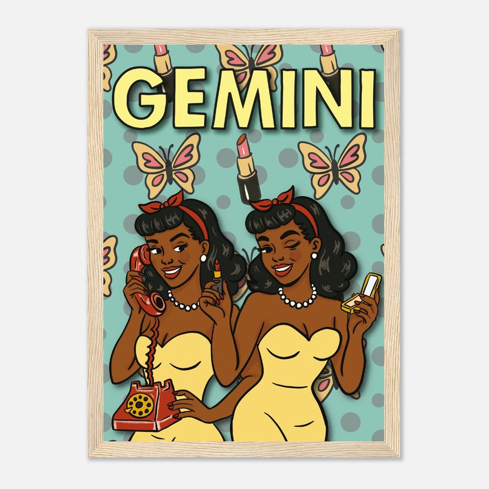 This pin-up print captures Gemini in her natural state: mid-conversation with herself, probably. Styled in true glam with retro charm and undeniable flirt energy, she’s surrounded by lipstick kisses and butterflies - because one persona is never enough.