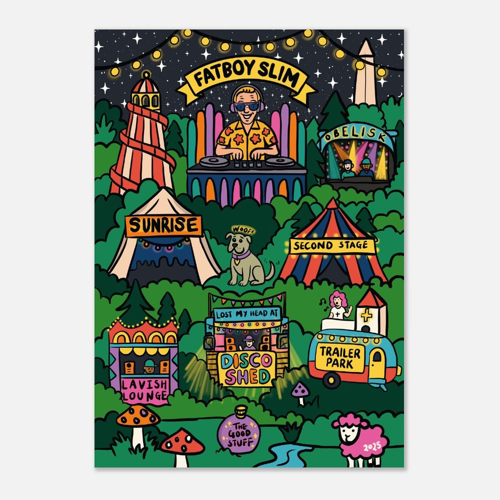 Get lost in the glitter-drenched, disco-dipped dreamscape of Latitude like you’ve never seen it before. This hand-illustrated poster reimagines the festival's most iconic stages in 2025 - from Fatboy Slim’s organ booth secret set at the top to the Trailer Park and pink sheep at the bottom - in a playful, psychedelic style bursting with colour and chaos.