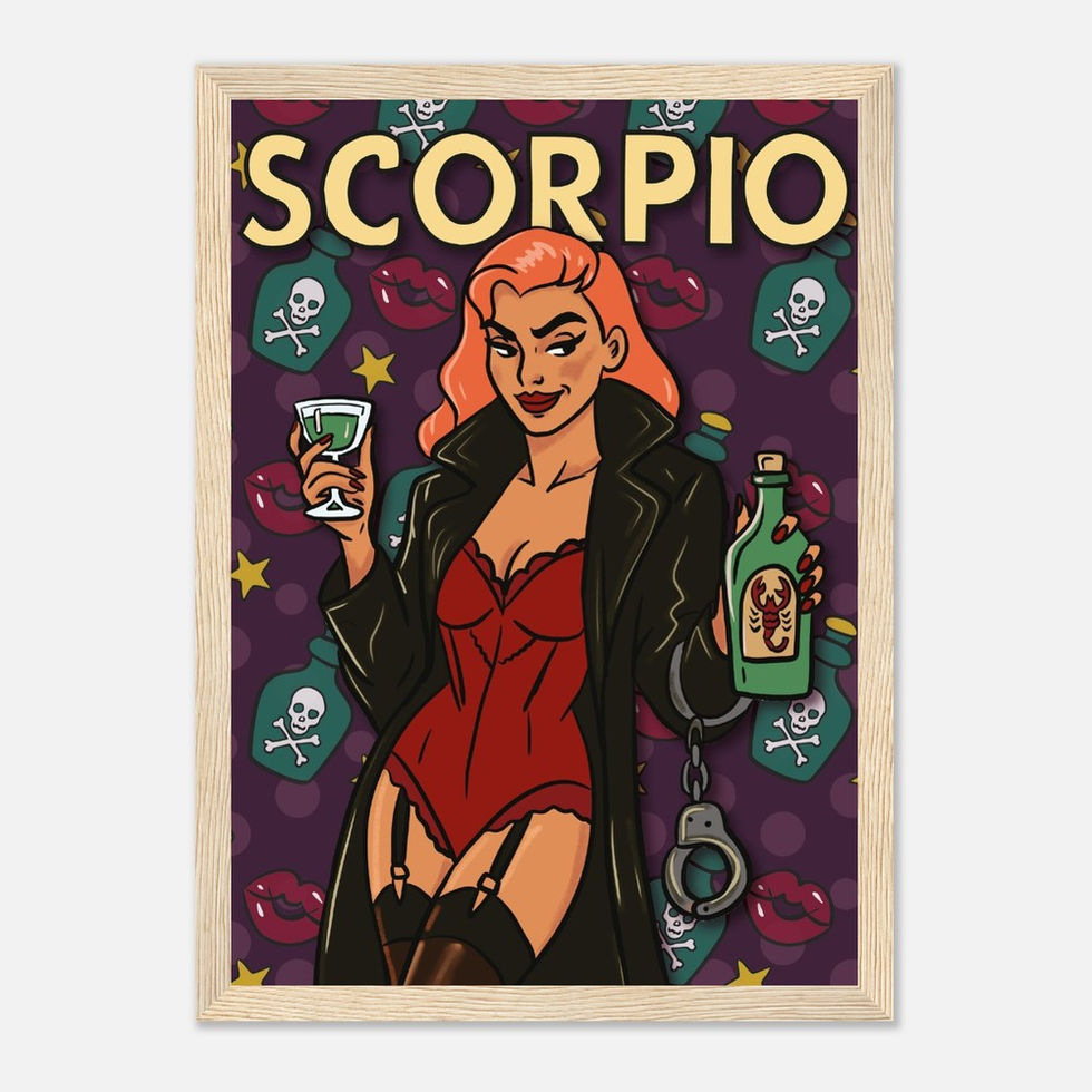 Dressed in vintage lingerie and wrapped in mystery, she’s the definition of magnetic chaos and seductive precision. Featuring details like a poison bottle stamped with a scorpion, and tasteful (but still threatening) handcuffs - this print is not for the faint of heart. She's powerful. She's passionate. She knows things.